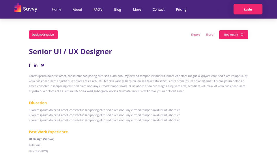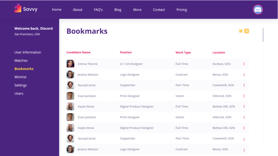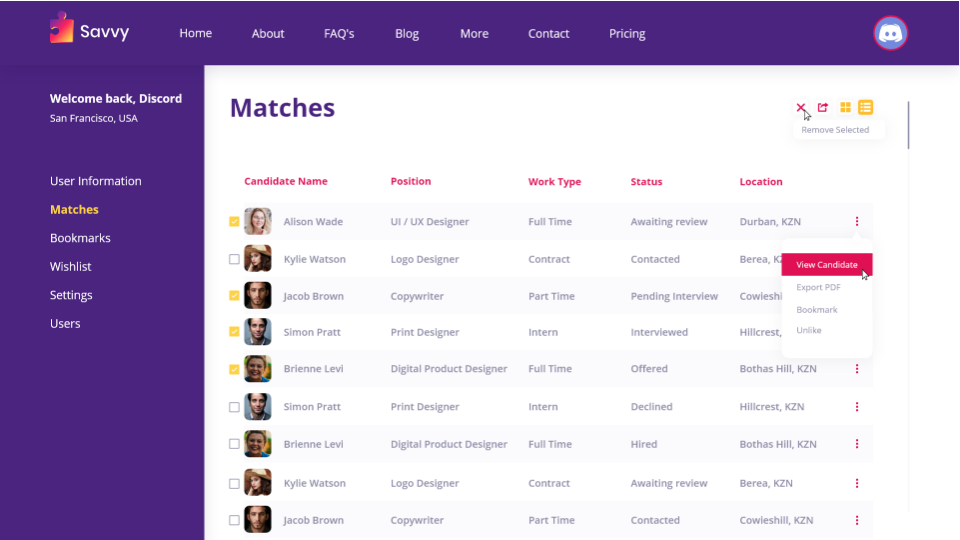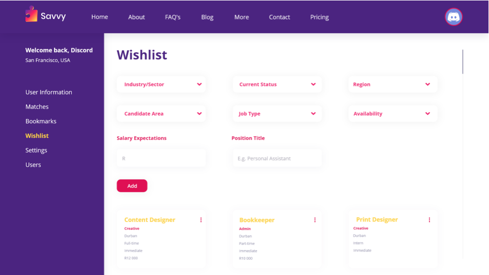 Imagine the perfect hybrid between Linkedin and Tinder - a place where business people can discover and connect with more professionals in their field based on a matching system. Savvy was a concept motivated by the idea of allowing more streamlined recruiting processes. Often recruiters and jobseekers alike reach out to each other and it ends up not being completely compatible - either skills don't quite measure up or motivations don't align.Savvy is a system meant to bridge that gap. By only being able to see and contact a candidate when you know that they are the right fit, you are able to save time and resources either as the hiring manager of a company, or as a third party recruiter.Sadly the project never made it to the development phase, but the interface is still one of my favourites out of all the projects I've worked on so far and the client is kind enough to allow me to use it for showcasing purposes.